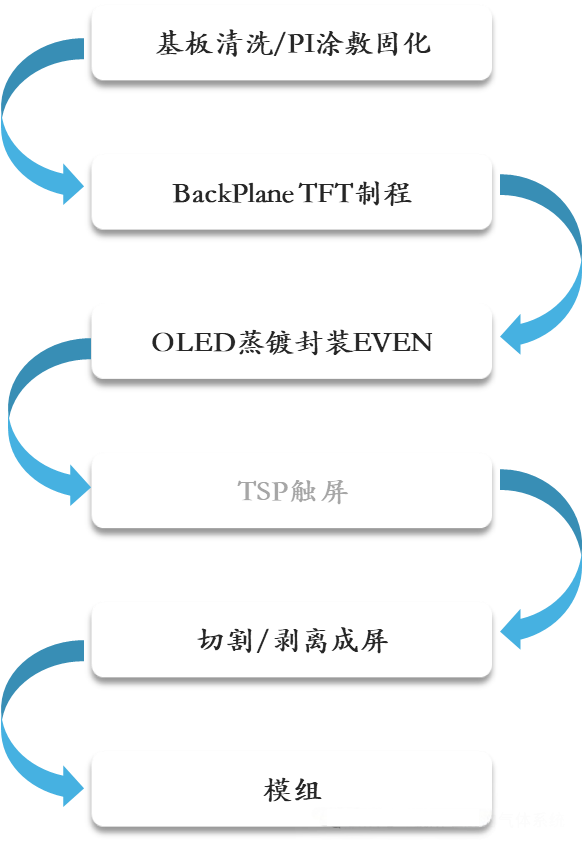AMOLED యొక్క ప్రధాన తయారీ ప్రక్రియ అనేక అత్యంత సాంకేతిక యూనిట్ ప్రక్రియలను కలిగి ఉంటుంది. బ్యాక్ప్లేన్ TFT (BP) ప్రక్రియలో, అధిక ఎలక్ట్రాన్ మొబిలిటీ కారణంగా తక్కువ-ఉష్ణోగ్రత పాలీక్రిస్టలైన్ సిలికాన్ (LTPS) సాంకేతికత ప్రధాన స్రవంతి అయింది. దాని టాప్-గేట్ నిర్మాణ ప్రక్రియలో బఫర్ లేయర్ డిపాజిషన్, ఛానల్ అయాన్ ఇంప్లాంటేషన్, లేజర్ ఎనియలింగ్ క్రిస్టలైజేషన్ (ELA), గేట్ మెటల్ స్పుట్టరింగ్ మరియు సోర్స్-డ్రెయిన్ ఇంప్లాంటేషన్ వంటి దశలు ఉంటాయి. థిన్ ఫిల్మ్ డిపాజిషన్, మోడిఫికేషన్ మరియు ఎచింగ్లో ప్రత్యేక వాయువులు కీలక పాత్ర పోషిస్తాయి: ఉదాహరణకు, PECVD ప్రక్రియలు a-Si/SiNx/SiOx సన్నని ఫిల్మ్లను డిపాజిట్ చేయడానికి SiH₄/N₂O/NH₃ని ఉపయోగిస్తాయి; అటామిక్ లేయర్ డిపాజిషన్ (ALD) Al₂O3 ఎన్క్యాప్సులేషన్ లేయర్లను రూపొందించడానికి TMA మరియు H₂Oలను ఉపయోగిస్తుంది; డ్రై ఎచింగ్ అనేది CF4/SF6/Cl2 వంటి వాయువుల ద్వారా అధిక-ఖచ్చితమైన నమూనాను సాధిస్తుంది, ఇక్కడ BCl3 మెటల్ ఆక్సైడ్ పొరలను తగ్గించడానికి ఉపయోగించబడుతుంది మరియు Cl2 అస్థిర ఎచింగ్ ఉత్పత్తులను ఉత్పత్తి చేస్తుంది, ఇది శుభ్రమైన మరియు సమర్థవంతమైన ప్రక్రియను నిర్ధారిస్తుంది.