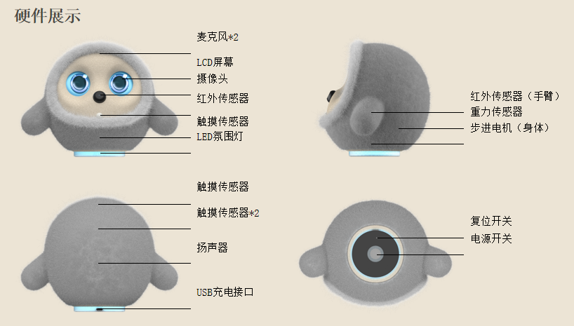 హ్యూమన్-మెషిన్ ఇంటరాక్షన్ మాడ్యూల్: 4.28-అంగుళాల LCD ఎక్స్ప్రెషన్ స్క్రీన్, 5W ఫుల్-రేంజ్ స్పీకర్, ఫుల్-కలర్ LED లైట్ స్ట్రిప్.